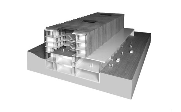 Le programme se développe dans un édifice à la structure régulière et à l'enveloppe énergétique plissée, capable d'organiser l'ensemble des fonctions et connections utiles dans un seul volume rectiligne et compact. Le soufflet du corps principal s'adapte à la trame constructive et aux besoins des utilisateurs. Son enveloppe lui procure plus de 30% de la consommation annuelle de ses installations électriques.