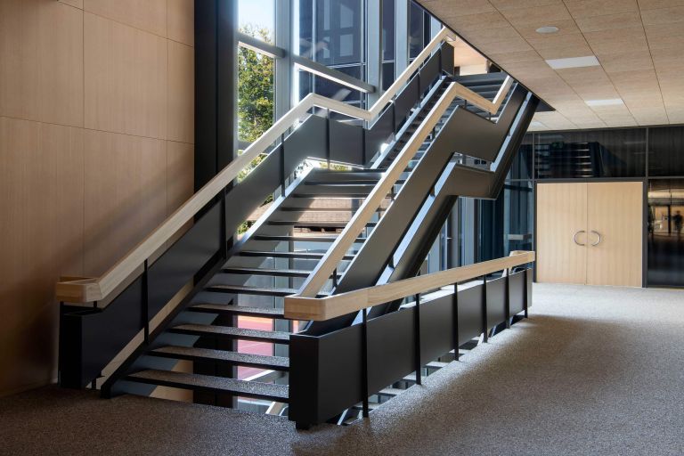 Dans le nouveau volume des salles de classe, le système structurel est linéaire dans les étages supérieurs. Cette mixité permet l'optimisation des portées statiques couvrant le balcon.