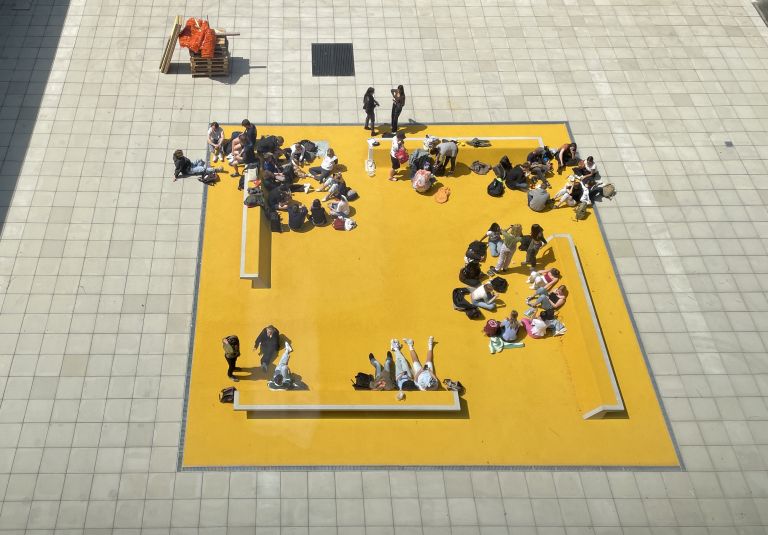 Les aménagements extérieurs sont entièrement réorganisés. De nouveaux parcours sont aménagés. Une zone de rencontre est envisagée sur la place des entrées principales. La terrasse au sud et le balcon formé sous le nouveau volume des salles de classe sont autant de nouveaux parcours en boucles permettant des promenades variées et la mise en scène du parc. Des zones d'infiltration lente des eaux de surface sont prévues aux endroits stratégiques. Le système se compose d'une surface partiellement filtrante (grave) complété d'un système drainant canalisant les eaux vers un milieu dit humide, de rétention et d'infiltration. Les toitures sont végétalisées.