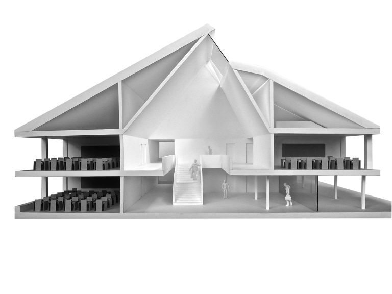 La typologie volumétrique du projet s’inspire des caractéristiques volumétriques des fermes environnantes. Grâce à leur configuration à quatre pans, les toits présentent une volumétrie réduite et organisent un éclairage zénithal puissant. Ce dispositif magnifie les circulations intérieures du bâtiment scolaire et diffuse une lumière naturelle et sans risque d’éblouissement dans les salles de sport.